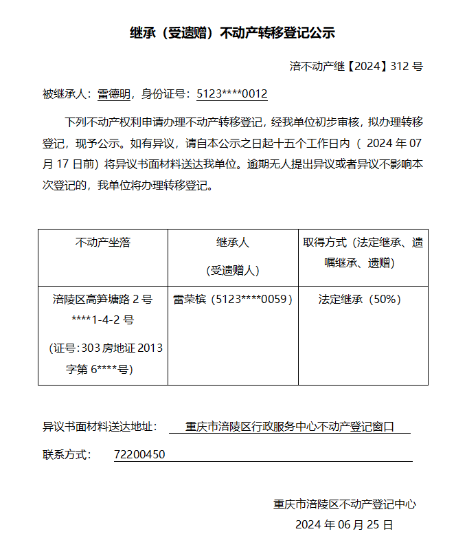 雷德明继承公告 涪不动产继【2024】312号