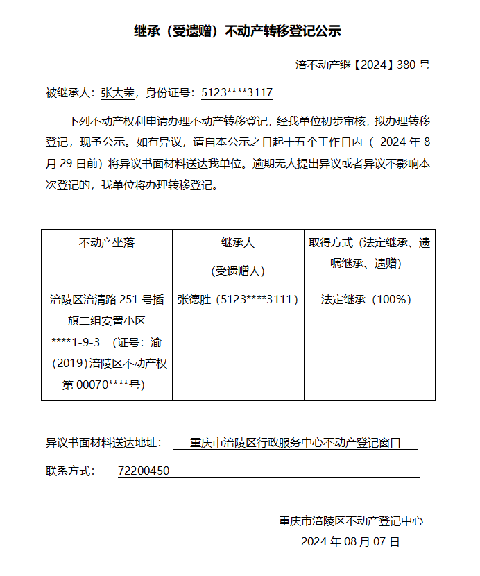 张大荣继承公告 涪不动产继【2024】380号