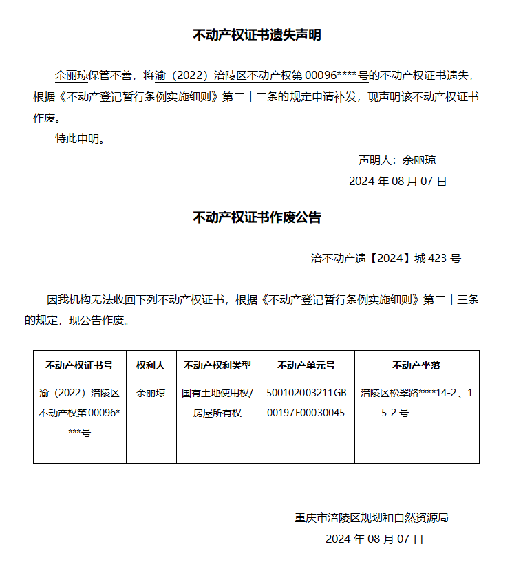 余丽琼遗失声明与作废公告 涪不动产遗【2024】城423号