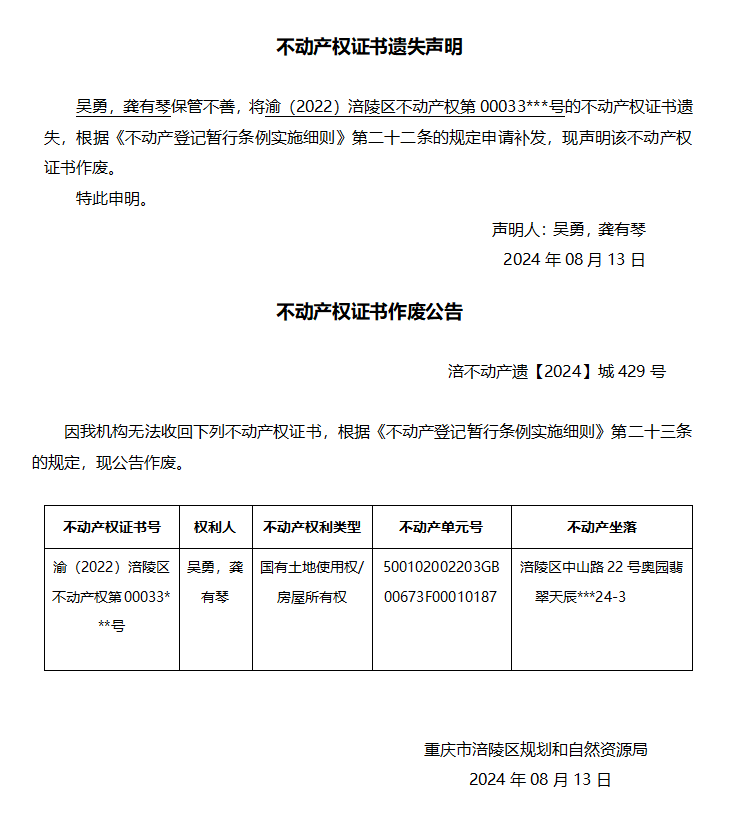 吴勇,龚有琴遗失声明与作废公告 涪不动产遗【2024】城429号