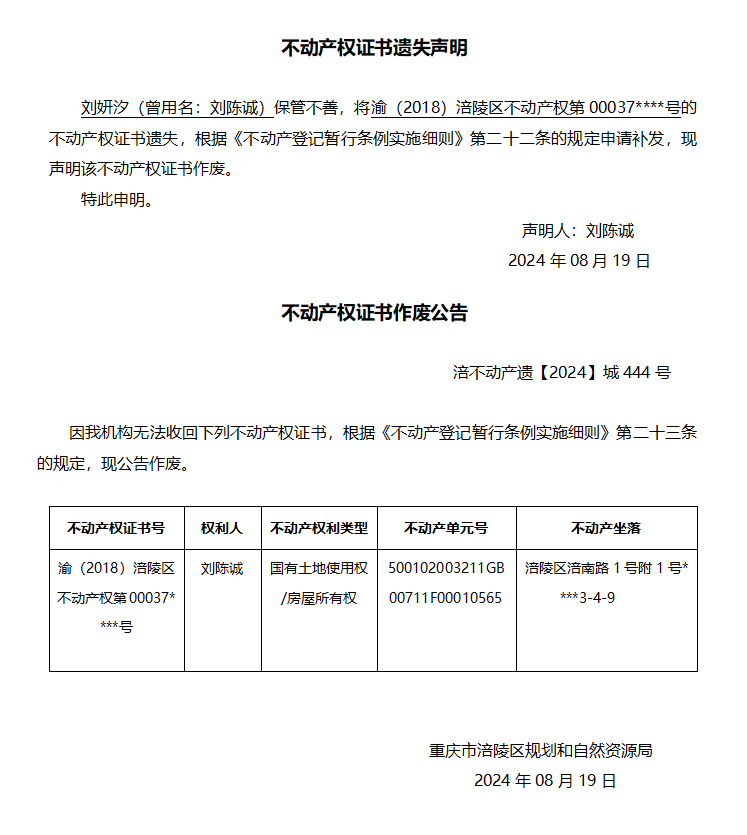 刘妍汐遗失声明与作废公告 涪不动产遗【2024】城444号
