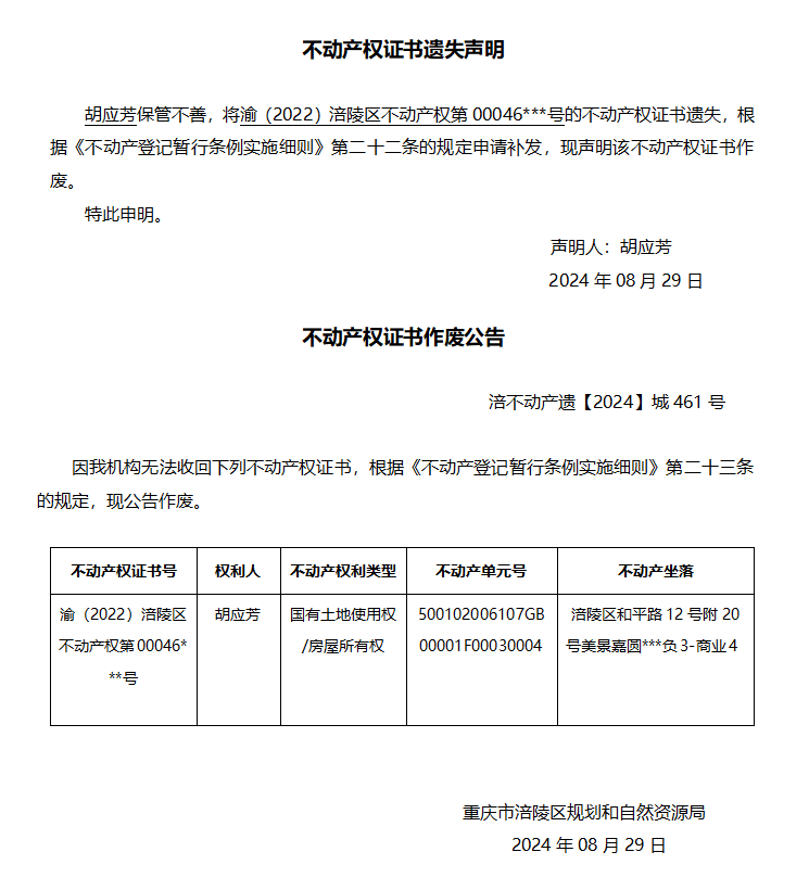 胡应芳遗失声明与作废公告 涪不动产遗【2024】城461号