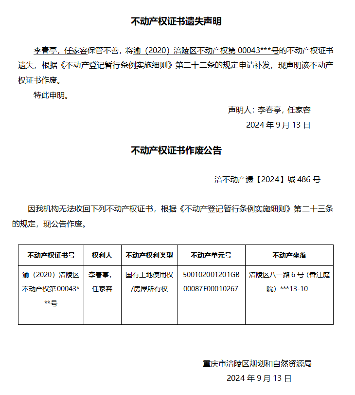 李春亭,任家容遗失声明与作废公告 涪不动产遗【2024】城486号