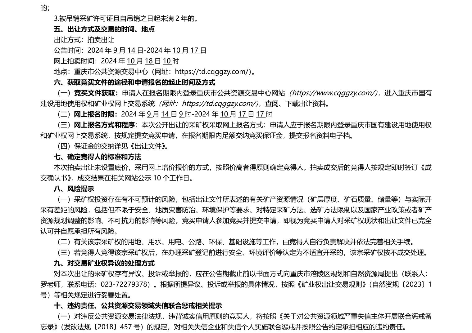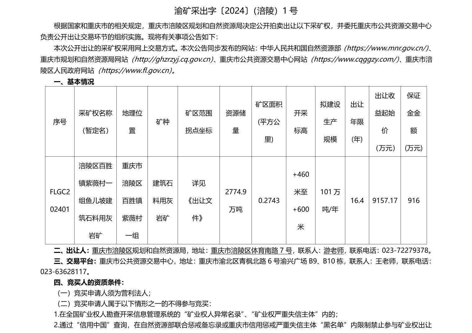 涪陵区百胜镇紫薇村一组鱼儿坡建筑石料用灰岩矿采矿权拍卖出让公告