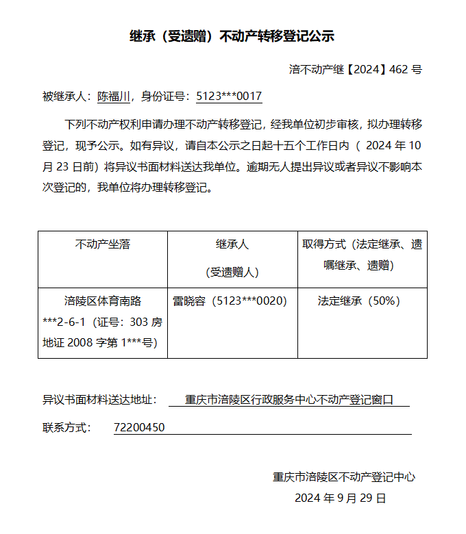 陈福川继承公告 涪不动产继【2024】462号