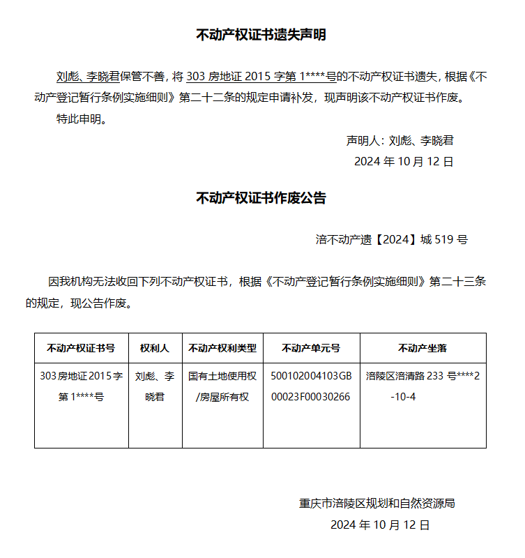 刘彪、李晓君遗失声明与作废公告 涪不动产遗【2024】城519号