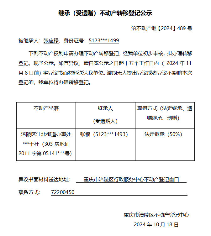 张应禄继承公告 涪不动产继【2024】489号