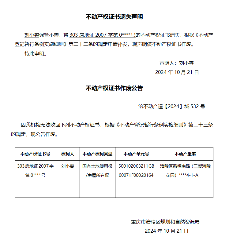 刘小容遗失声明与作废公告 涪不动产遗【2024】城532号
