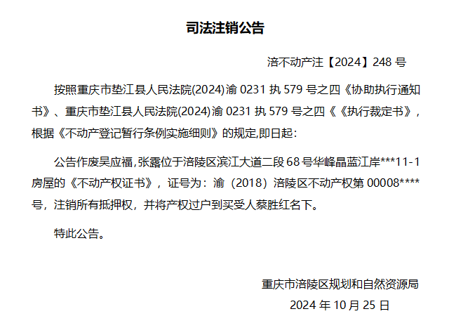 吴应福,张露司法注销公告 涪不动产注【2024】248号