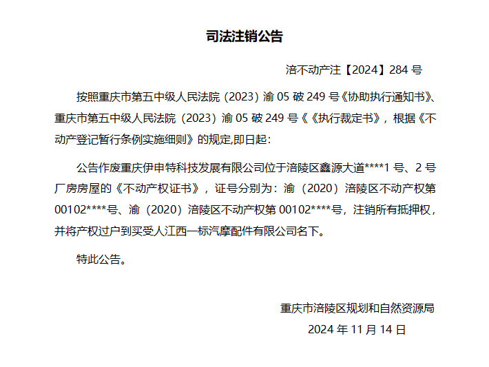 重庆伊申特科技发展有限公司司法注销公告 涪不动产注【2024】284号