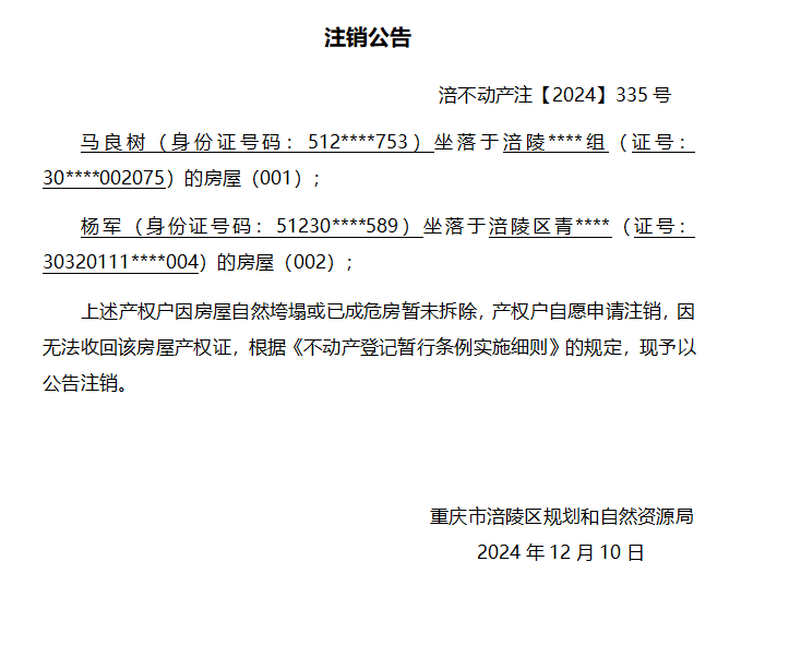 马良树等注销公告 涪不动产注【2024】335号