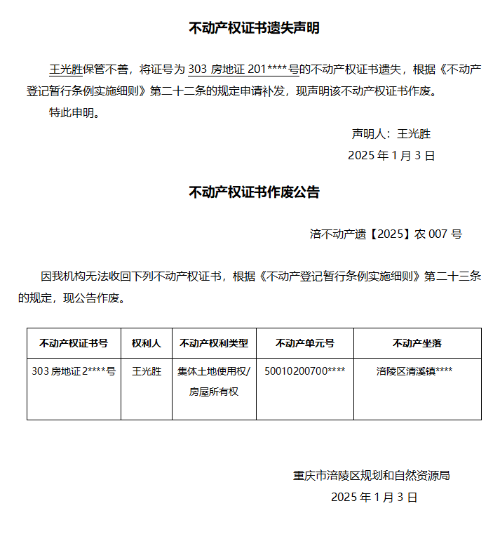 王光胜遗失声明与作废公告 涪不动产遗【2025】农007 号