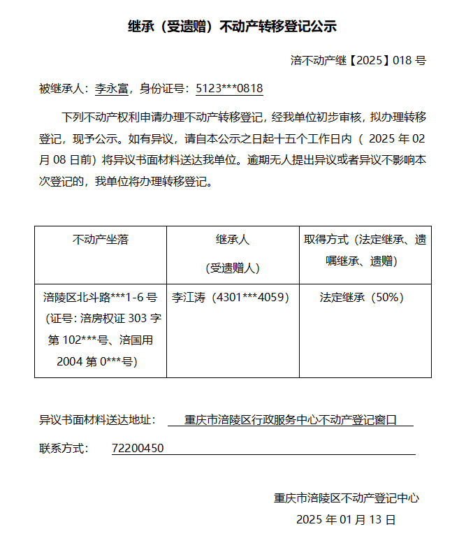李永富继承公告 涪不动产继【2025】018号
