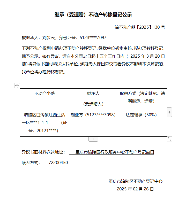 刘步云涪不动产继【2025】130号