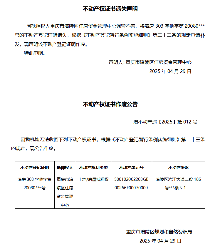 重庆市涪陵区住房资金管理中心涪不动产遗【2025】抵012号
