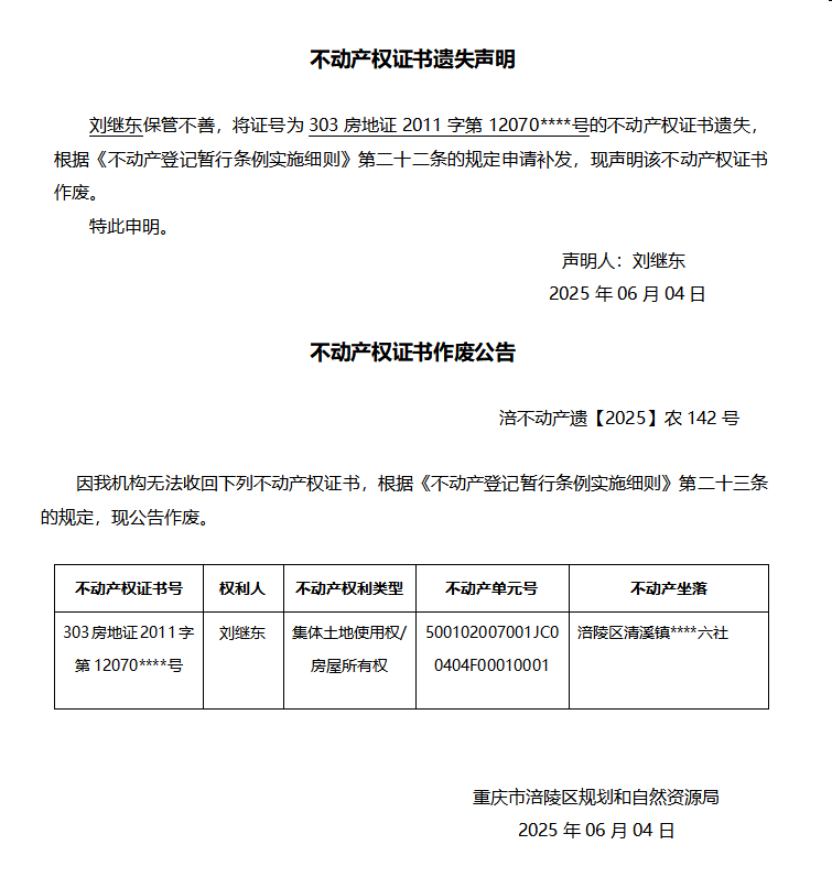 刘继东涪不动产遗【2025】农142号