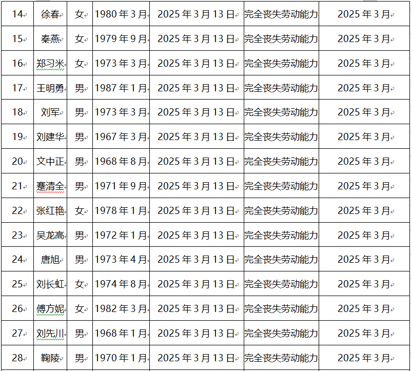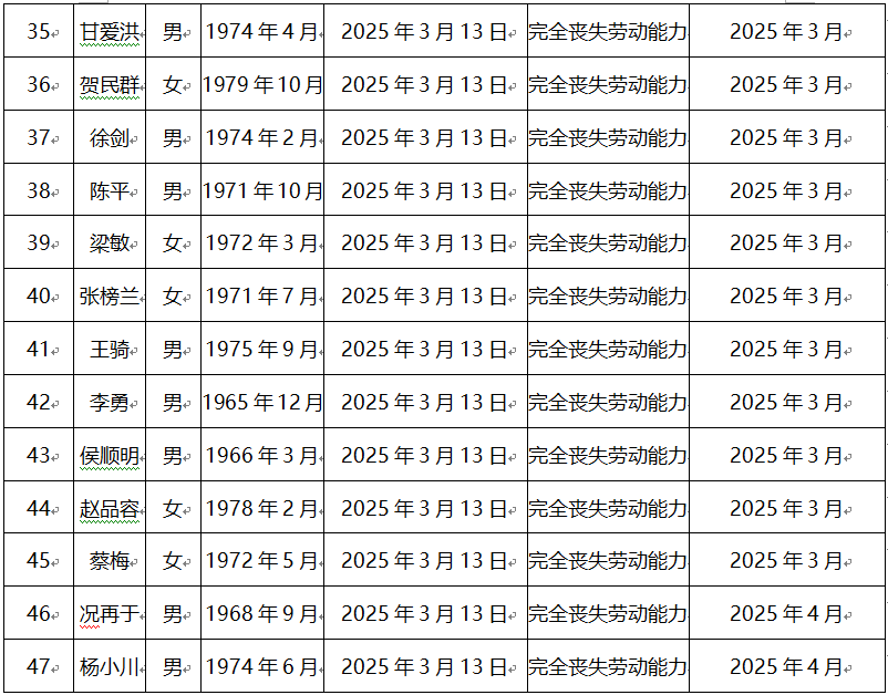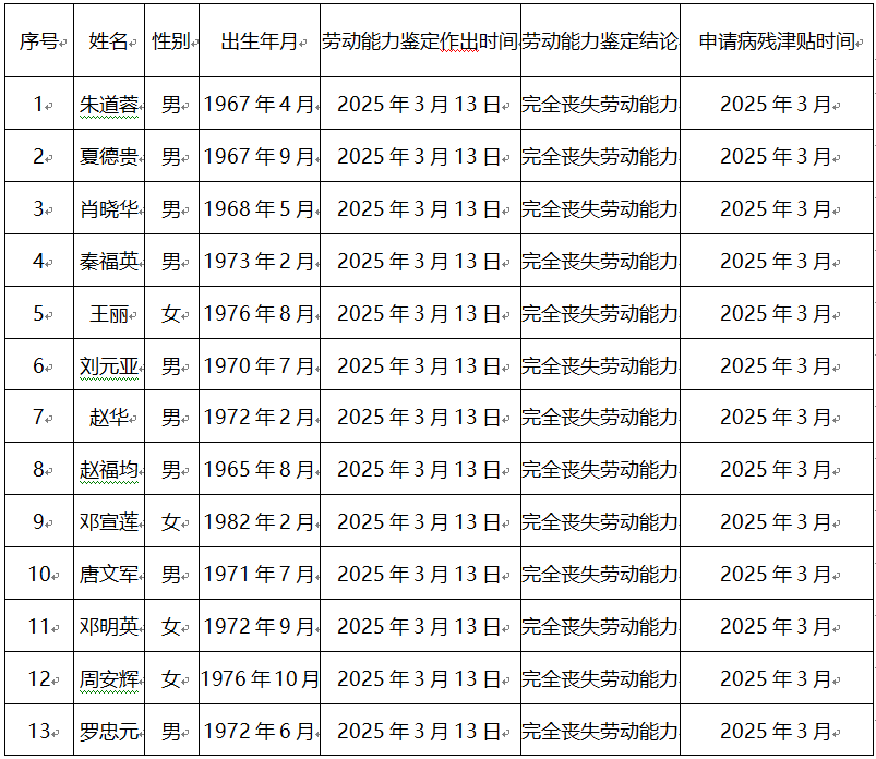 根据《人力资源和社会保障部财政部关于印发〈企业职工基本养老保险病残津贴暂行办法〉的通知》(人社部发〔2024〕72号)文件规定,经初步审核,拟对以下47名申请人员办理病残津贴,现公示如下: