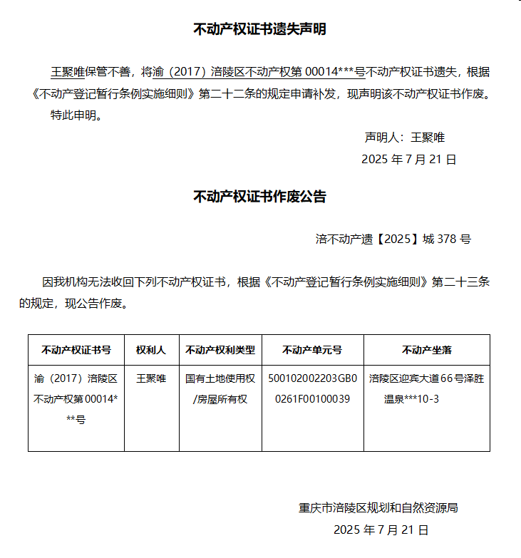 王聚唯 涪不动产遗【2025】城378号