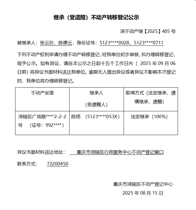 张云珍、陈德云涪不动产继【2025】485号