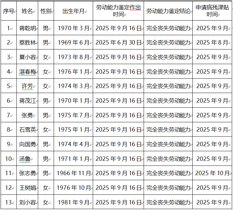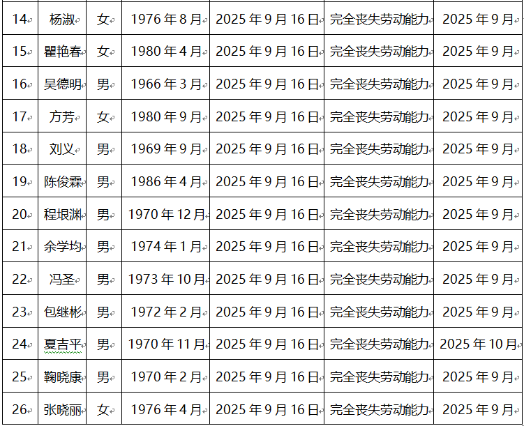 根据《人力资源和社会保障部财政部关于印发〈企业职工基本养老保险病残津贴暂行办法〉的通知》(人社部发〔2024〕72号)文件规定,经初步审核,拟对以下26名申请人员办理病残津贴,现公示如下: