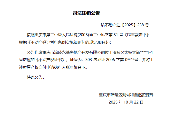 重庆市涪陵永基房地产开发有限公司涪不动产注(2025)238号