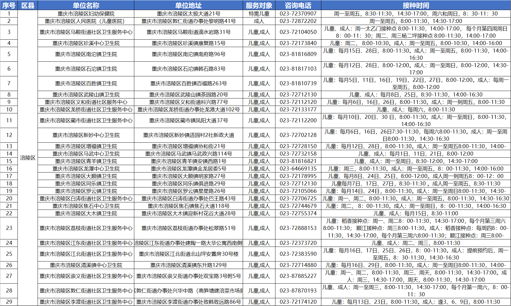 2025年重庆市涪陵区提供流感疫苗预防接种服务单位名单