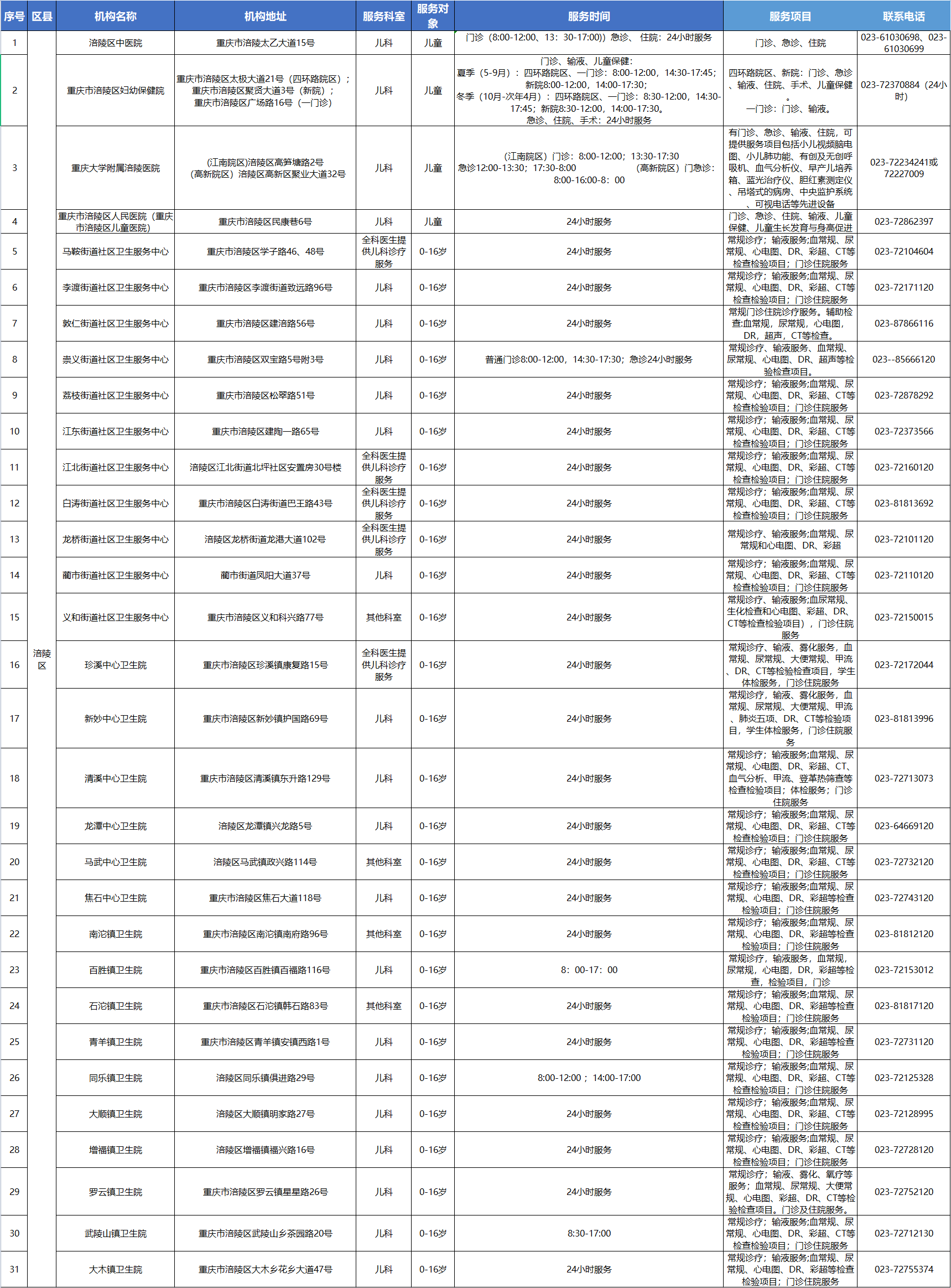 2025年重庆市涪陵区公立机构提供儿科诊疗服务单位名单