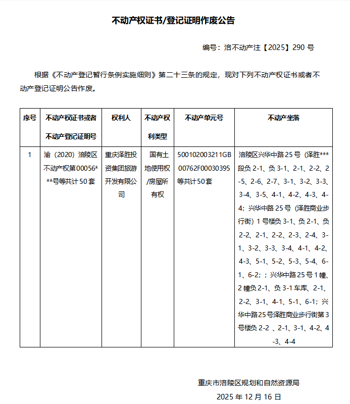 重庆泽胜投资集团旅游开发有限公司涪不动产注(2025)290号