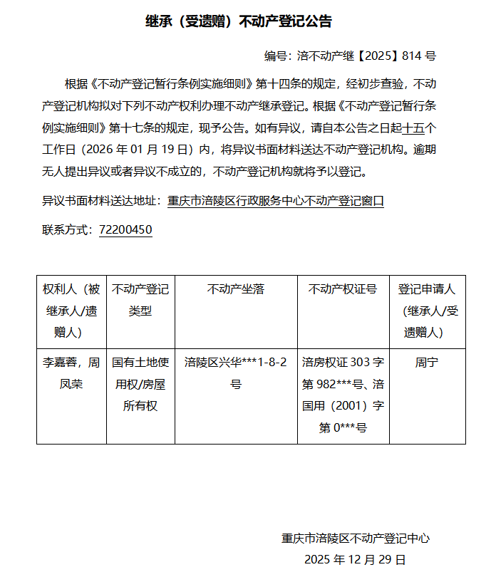 李嘉蓉,周凤荣涪不动产继【2025】814号