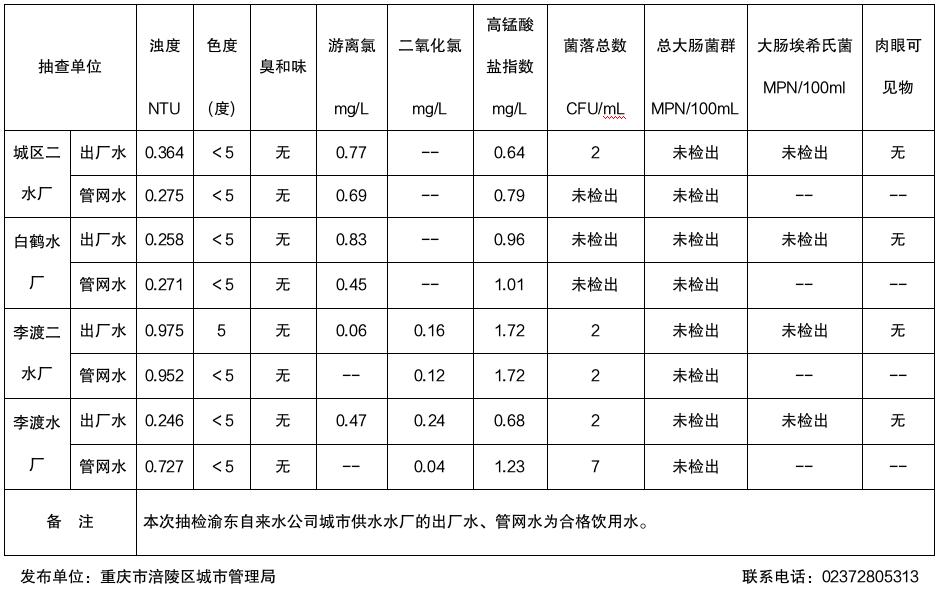 涪陵区城市管理局委托重庆市清泽水质监测有限公司对渝东自来水公司城市供水水厂12月的出厂水、管网水进行检测,抽检结果公布如下: