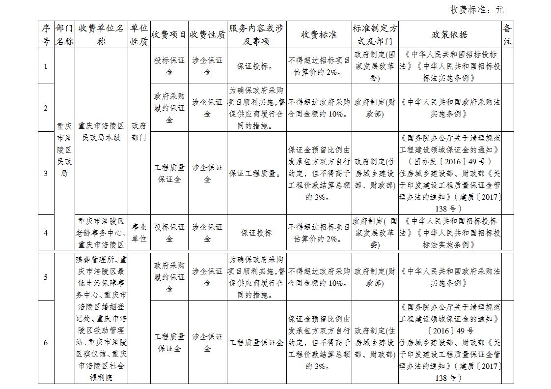 重庆市涪陵区民政局及直属单位综合性涉企收费目录清单