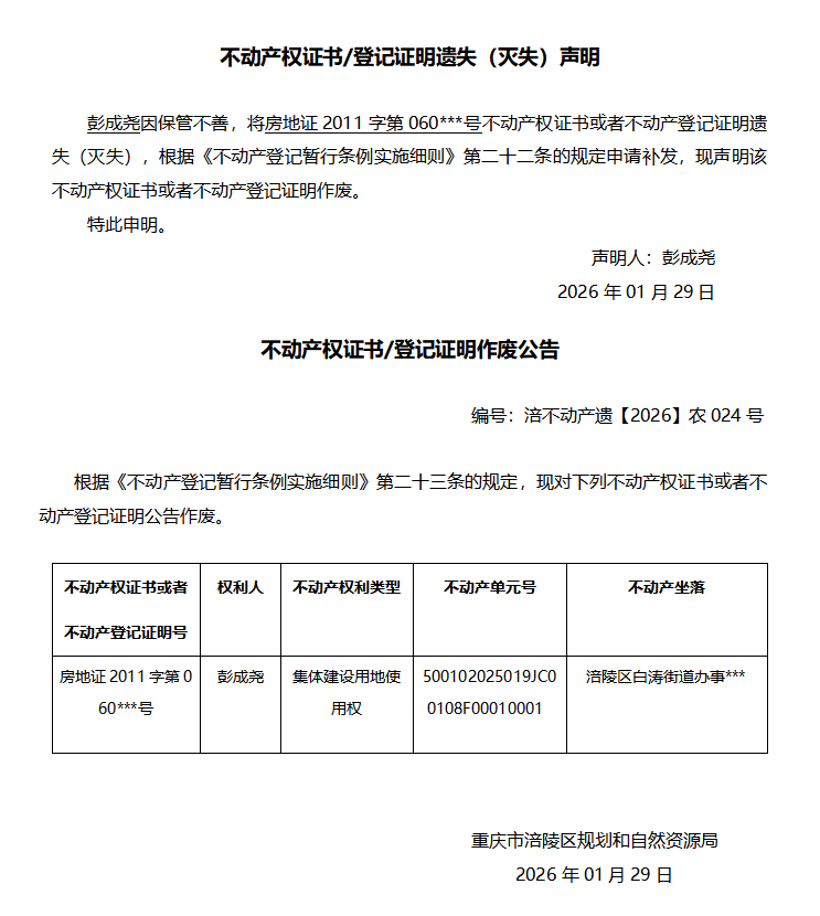 彭成尧涪不动产遗【2026】农024号