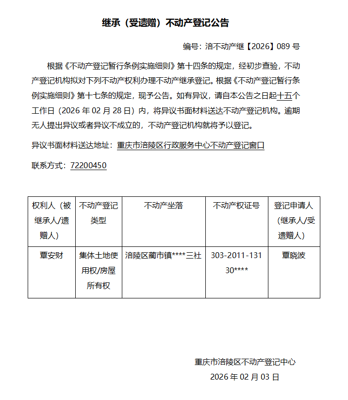 覃安财涪不动产继【2026】089号