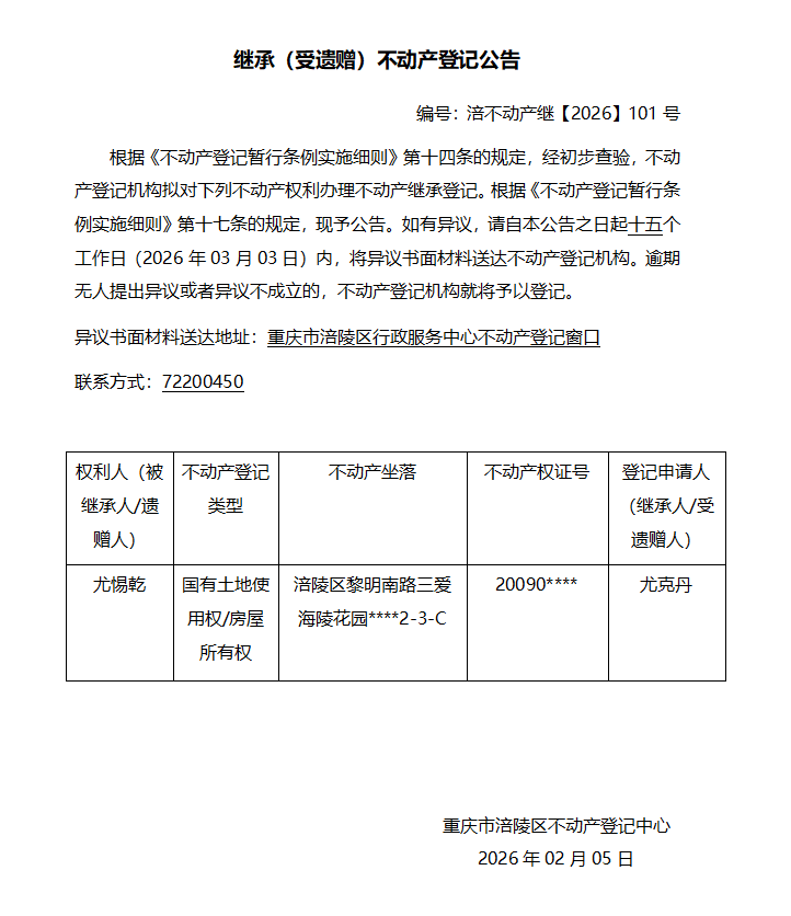 尤惕乾涪不动产继【2026】101号