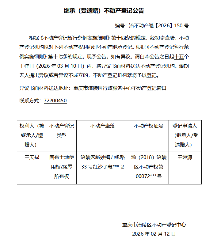 王天禄涪不动产继【2026】150号