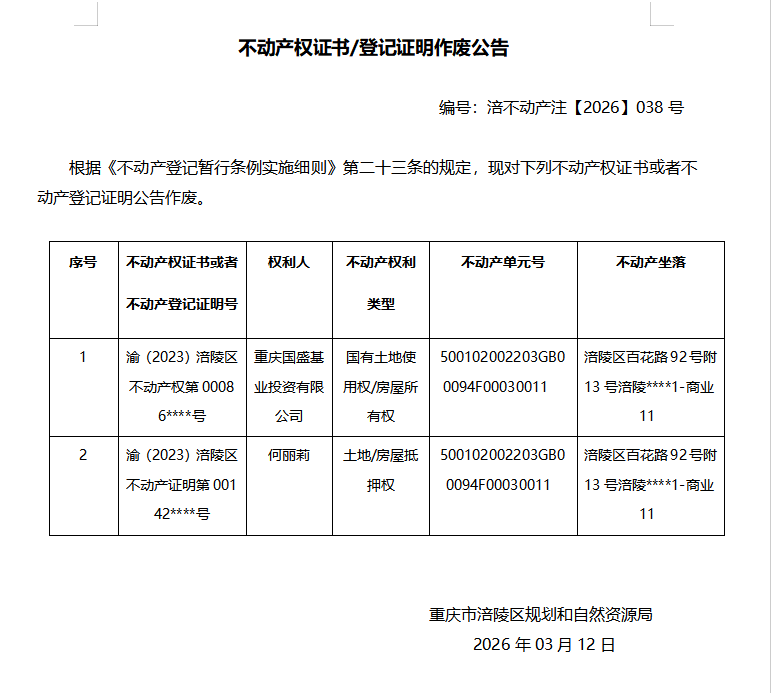 重庆国盛基业投资有限公司涪不动产注(2026)038号