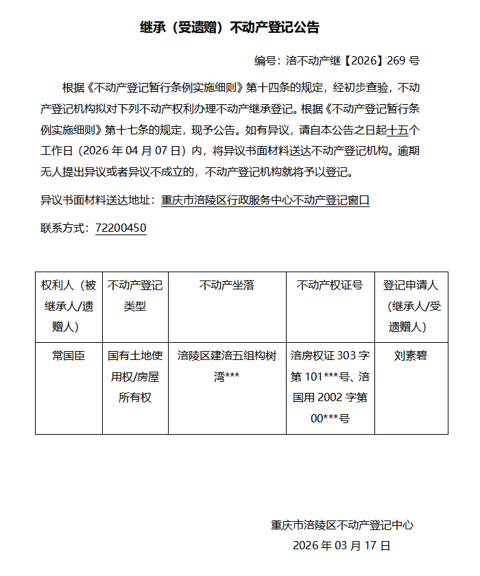 常国臣涪不动产继【2026】269号