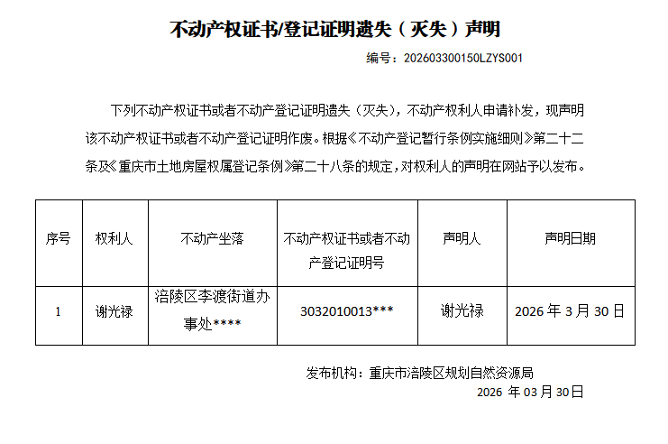 涪陵区不动产遗失(灭失)公告202603300150LZYS001号