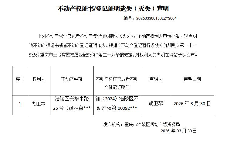 涪陵区不动产遗失(灭失)公告202603300150LZYS004号