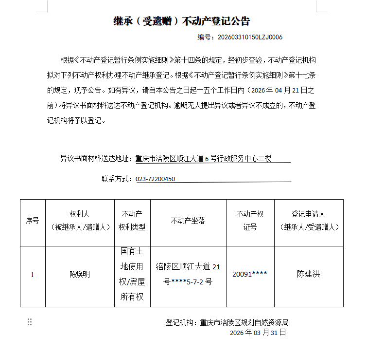 涪陵区不动产继承公告202603310150LZJC006号