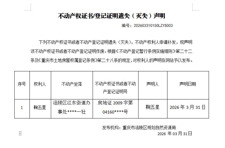 涪陵区不动产遗失(灭失)公告202603310150LZYS003号
