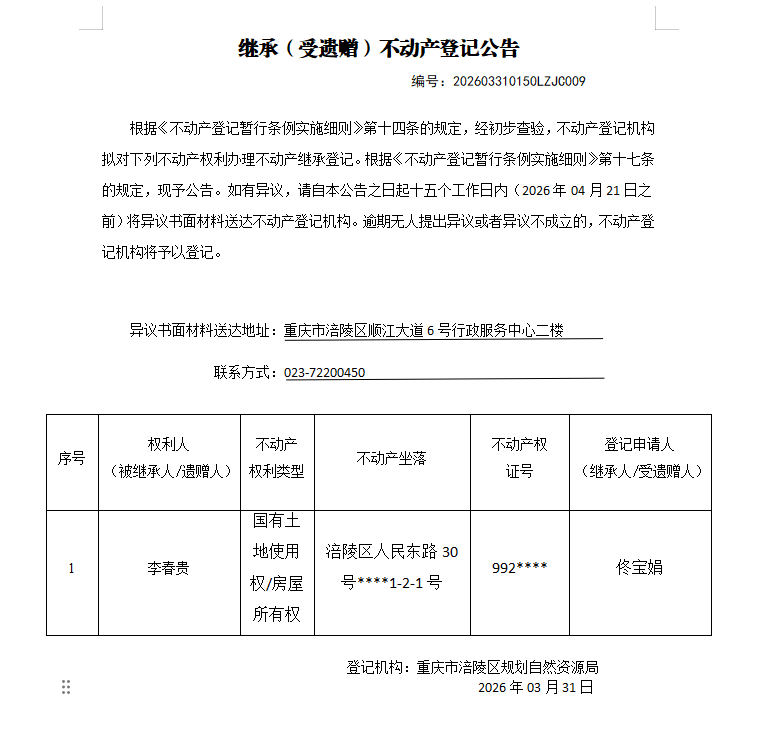 涪陵区不动产继承公告202603310150LZJC009号