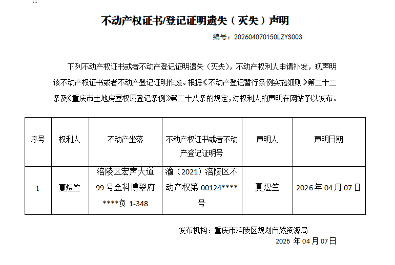涪陵区不动产遗失(灭失)公告202604070150LZYS003号