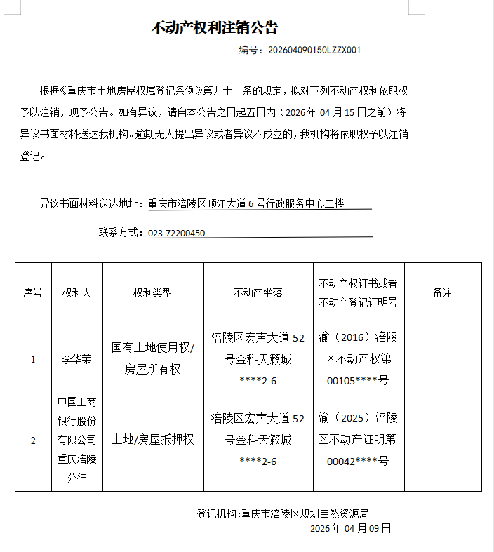 涪陵区不动产注销公告202604090150LZZX001号