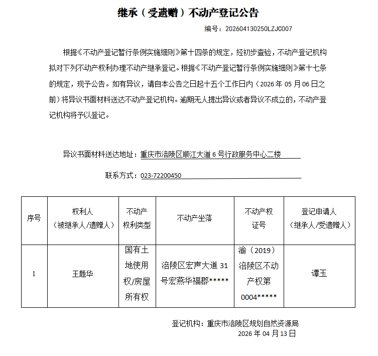 涪陵区不动产继承公告202604130250LZJC007号