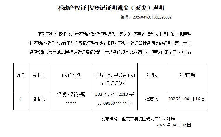 涪陵区不动产遗失(灭失)公告202604160150LZYS002号