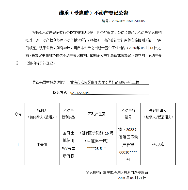 涪陵区不动产继承公告202604210250LZJC005号
