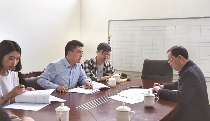 樊伟强(左二)在为企业相关负责人讲解惠企政策 记者 汪媛颖 摄