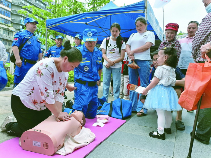 市民参与积极性非常高,领取资料、咨询问题,络绎不绝。特别是在“心肺复苏”展示现场,来自涪陵区红十字蓝天救援队的专业救援人员讲解演示急救知识,市民排队体验学习急救技能。“经常看到类似的急救视频,今天还是第一次实操学习,希望多开展这样的宣传活动。”市民兰波说。