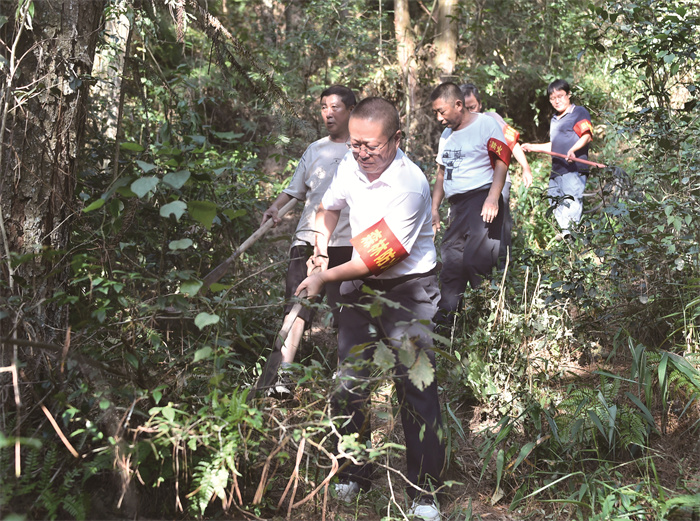 8月25日,在涪陵区大木乡土井村,来自区林业局驻村工作队的周军和同事一起,带着砍刀和铁扫帚,深入林间小道,开展森林防火巡查工作。